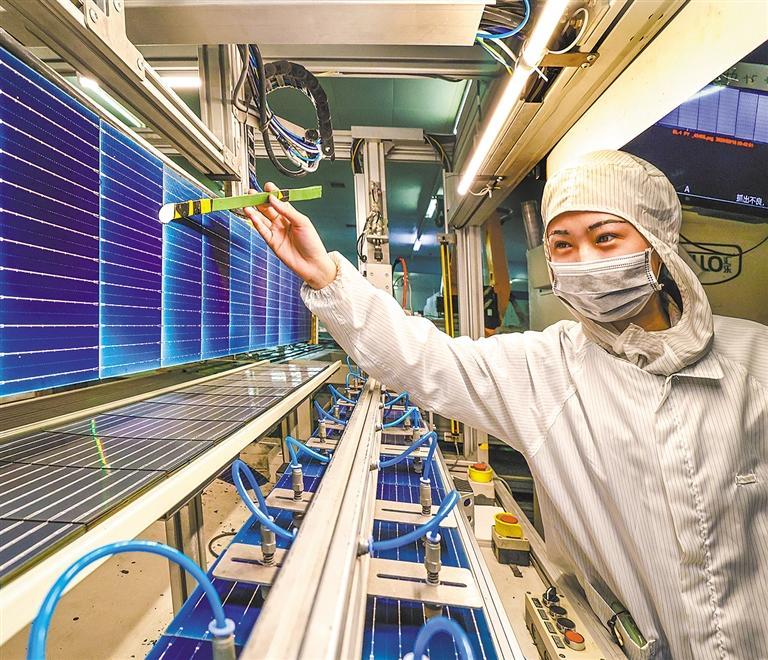 2月18日,安徽省马鞍山经开区茂迪新能源有限公司生产车间,员工在赶制太阳能光伏组件。王文生摄(中经视觉)