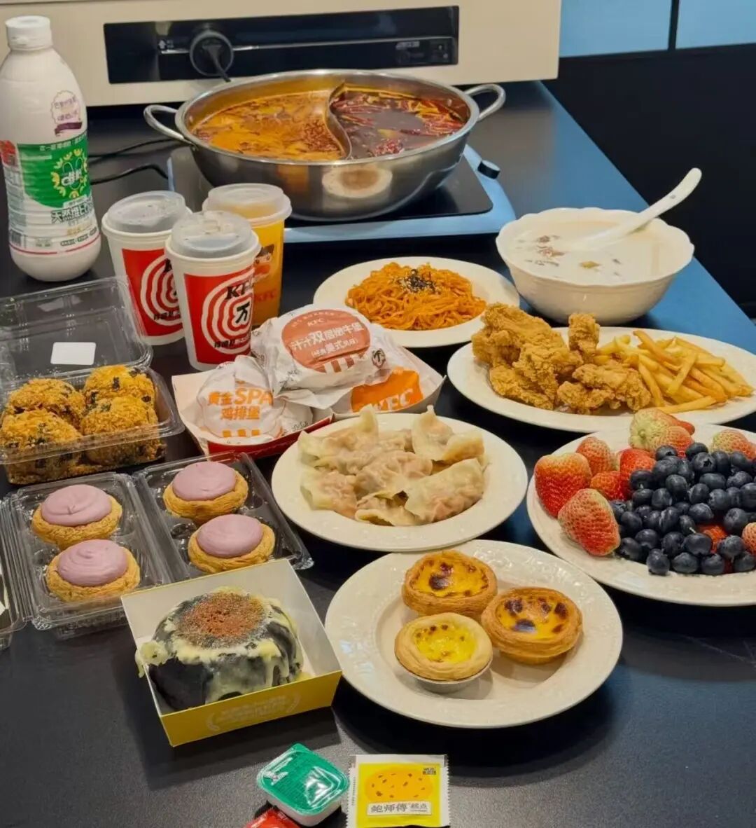 水果拼盘、拌火鸡面、碗装奶茶