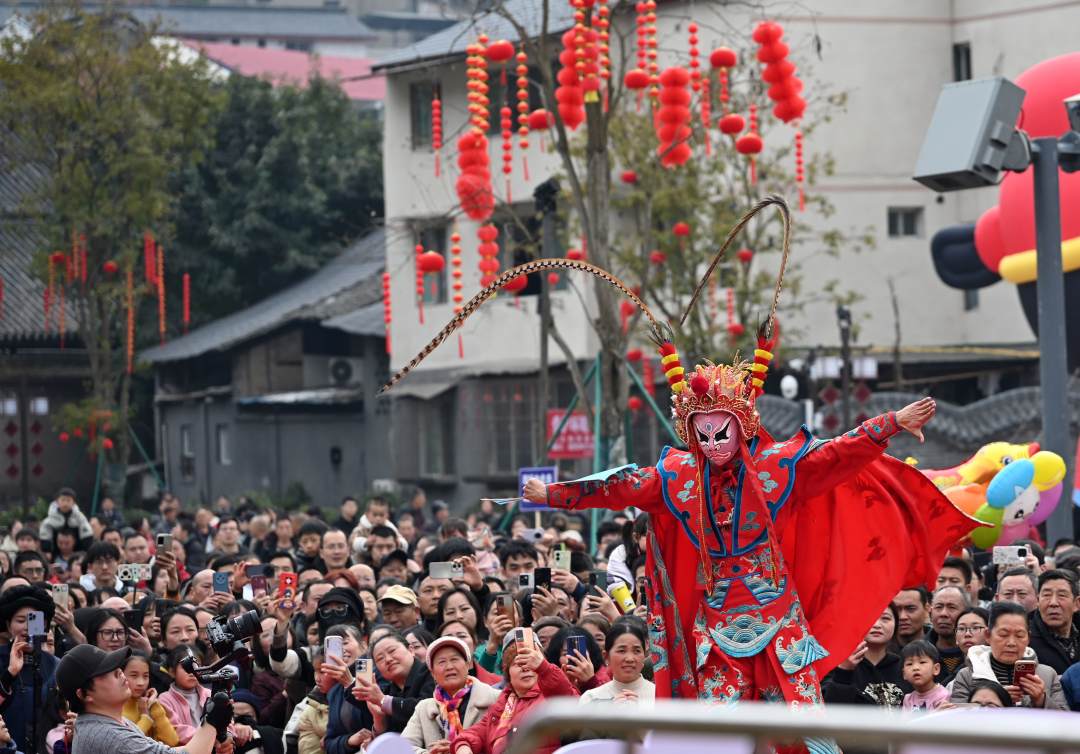 2月18日,四川省资中县青云广场,川剧演员在表演变脸。