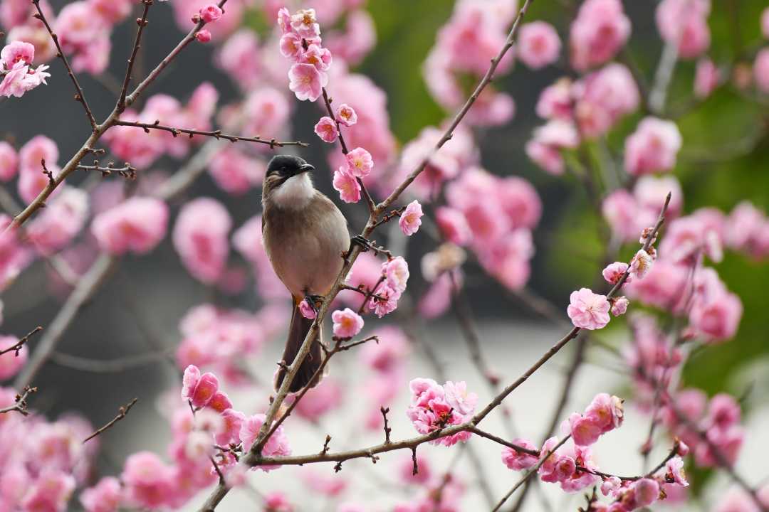 在贵州省仁怀市,鸟儿在花枝上停歇,一派生机盎然的景象。