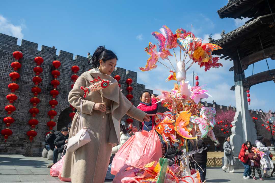 2月18日,游客在安徽省黄山市歙县徽州古城非遗集市上选购文创产品。
