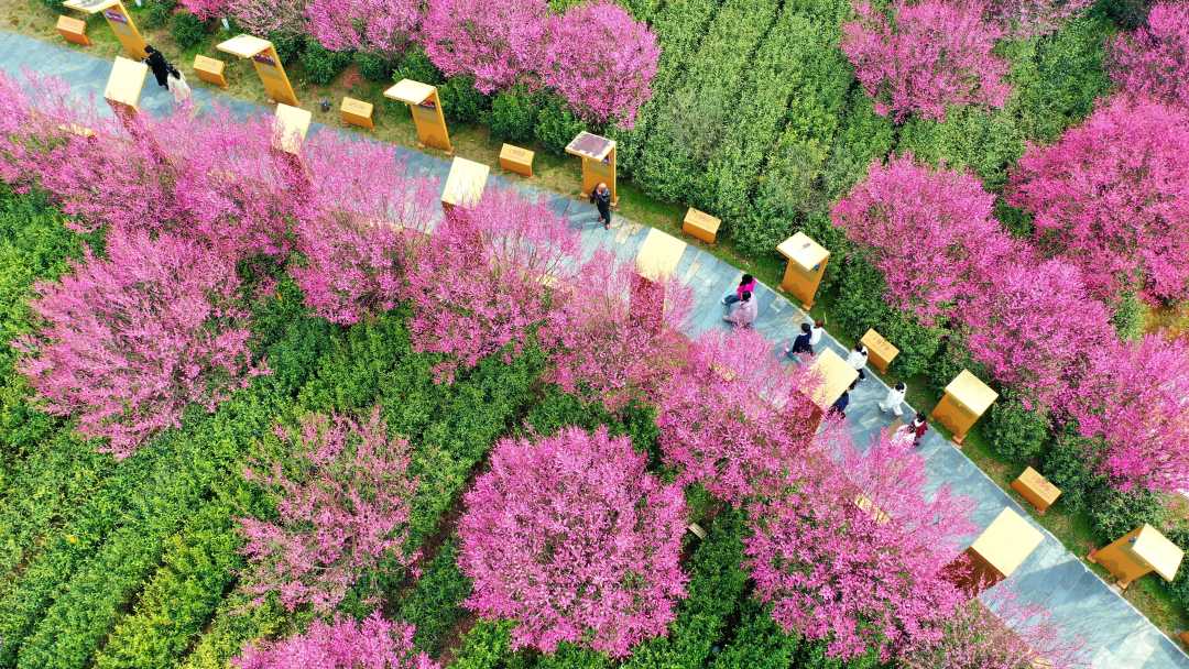 2月18日,安徽省舒城县舒茶镇九一六茶园春梅绽放,吸引市民前来踏春,乐享假期美好春色。