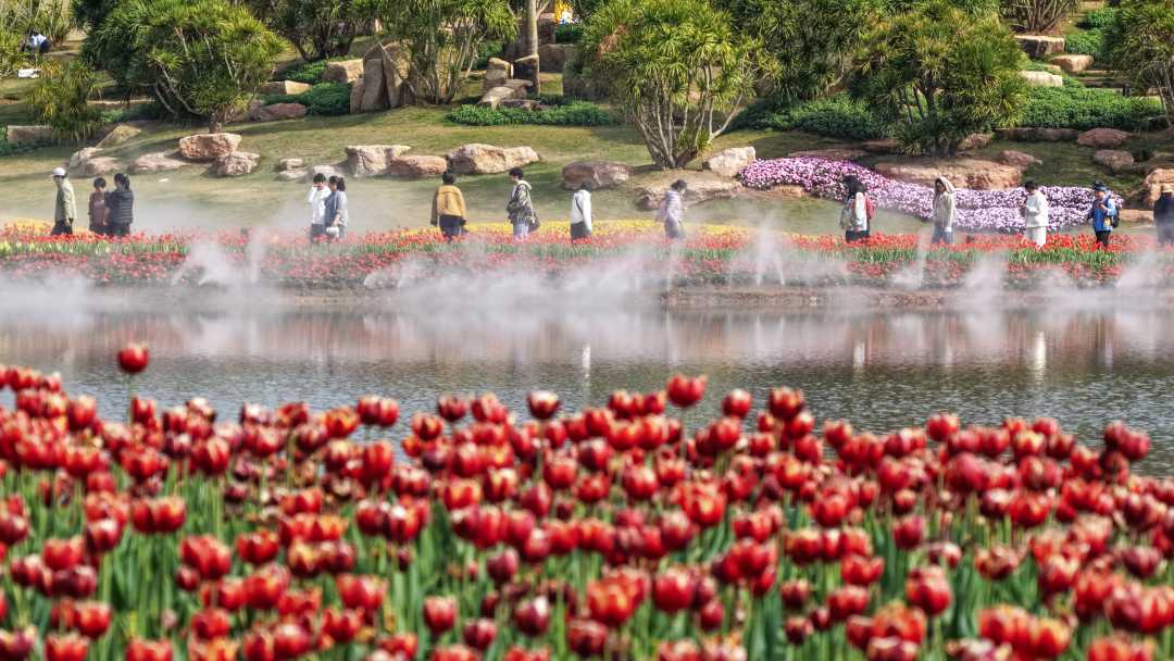 2月20日,广西南宁市青秀山风景区丘石花园12万株郁金香绚丽绽放,吸引市民游客前来踏春赏花,乐享美好假期。