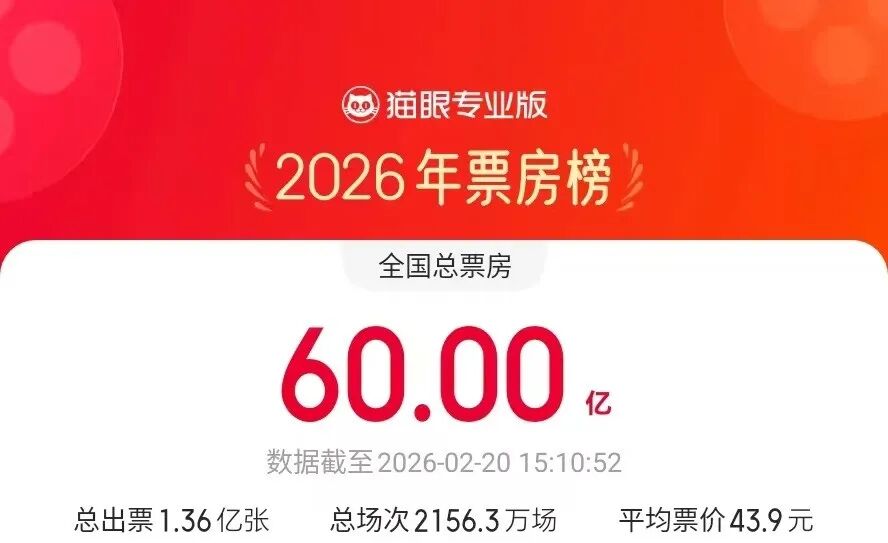 ■截至20日15时10分,2026年年度总票房(含预售)突破60亿元。《飞驰人生3》《惊蛰无声》《疯狂动物城2》暂列年度票房榜前三位。
