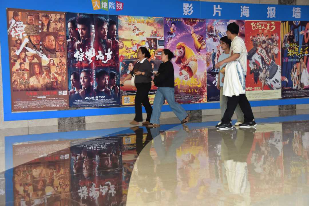 2月19日,观众从云南省蒙自市喜悦国际影城电影海报前经过。截至2月21日12时03分,2026年春节档电影总票房(含预售)已突破40亿元。