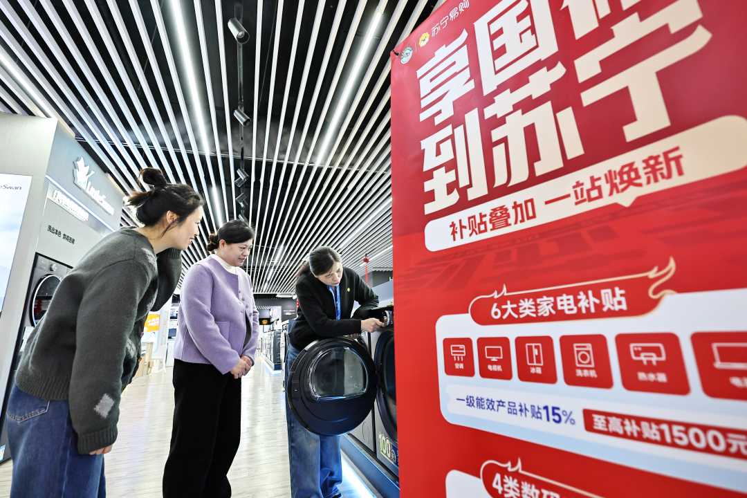 2月21日,消费者在浙江省嘉兴市南湖区一家家电卖场选购洗衣机。嘉兴各大家电卖场和汽车销售门店推出“新春焕新”消费系列促销活动,吸引众多消费者。