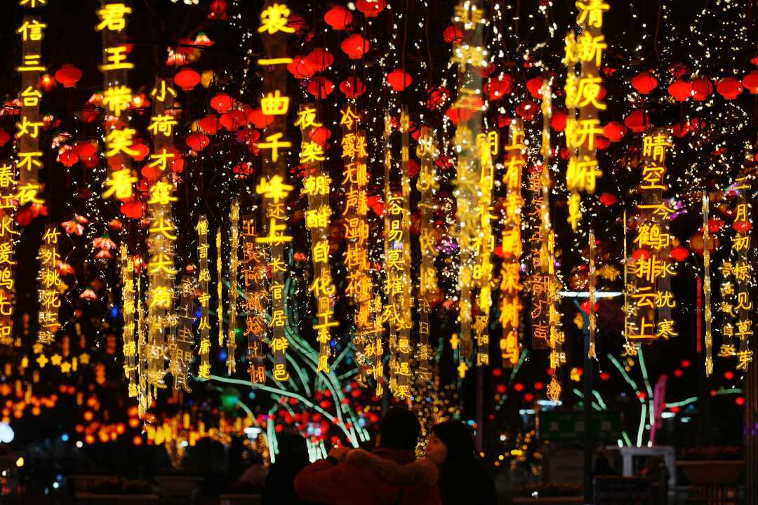 节日期间,克拉玛依市克拉玛依区文化街上花灯绽放,文化味十足。崔文娟摄