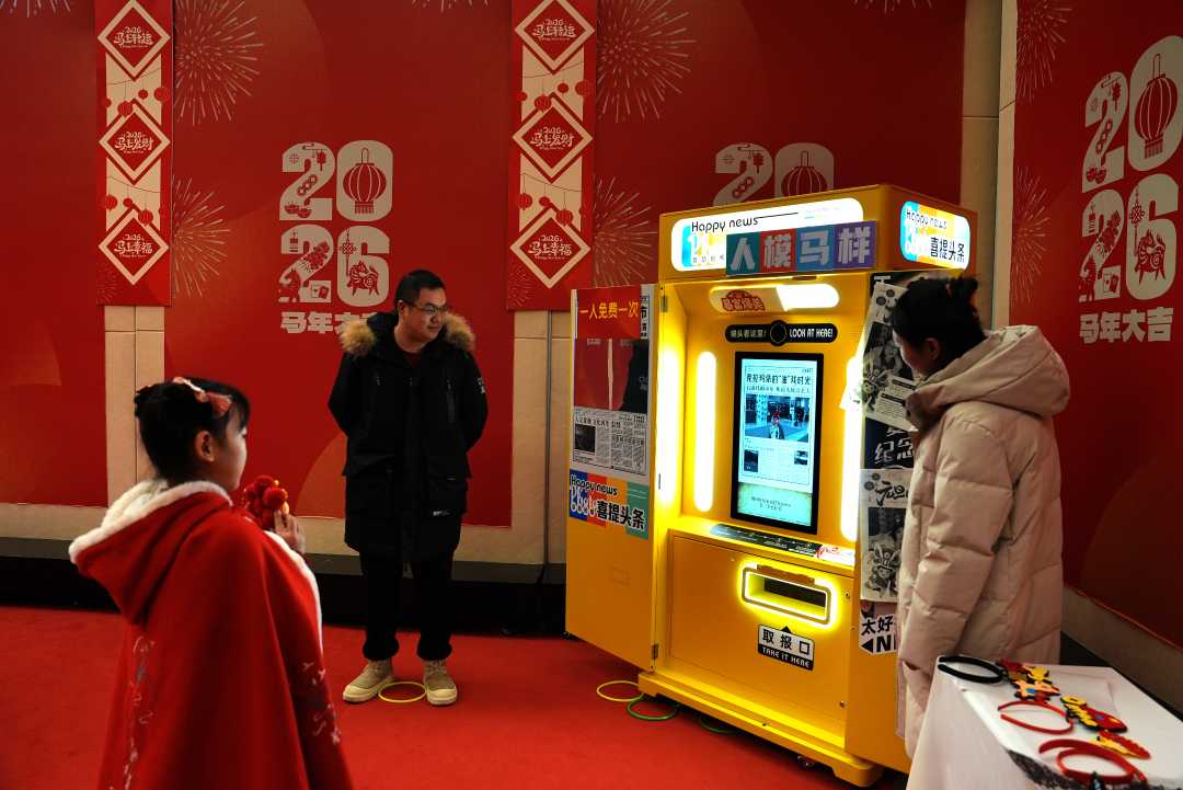在克拉玛依市美术馆,当地孩子在“喜提头条”设备前拍照,领取她登上头条的“报纸”。崔文娟摄