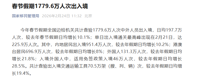 今年春节假期全国边检机关共计查验1779.6万人次中外人员出入境,日均197.7万人次,较去年春节假期日均增长10.1%;单日出入境通关最高峰出现在2月21日,达225.9万人次。其中,内地居民出入境951.4万人次,较去年假期日均增长10.2%;港澳台居民696.9万人次,较去年假期日均增长8%;外国人131.3万人次,较去年假期日均增长21.8%;入境外国人中,适用免签政策入境46万人次,较去年假期日均增长28.5%。共计查验出入境交通运输工具70.5万架(艘、列、辆)次,较去年假期日均增长19.4%。