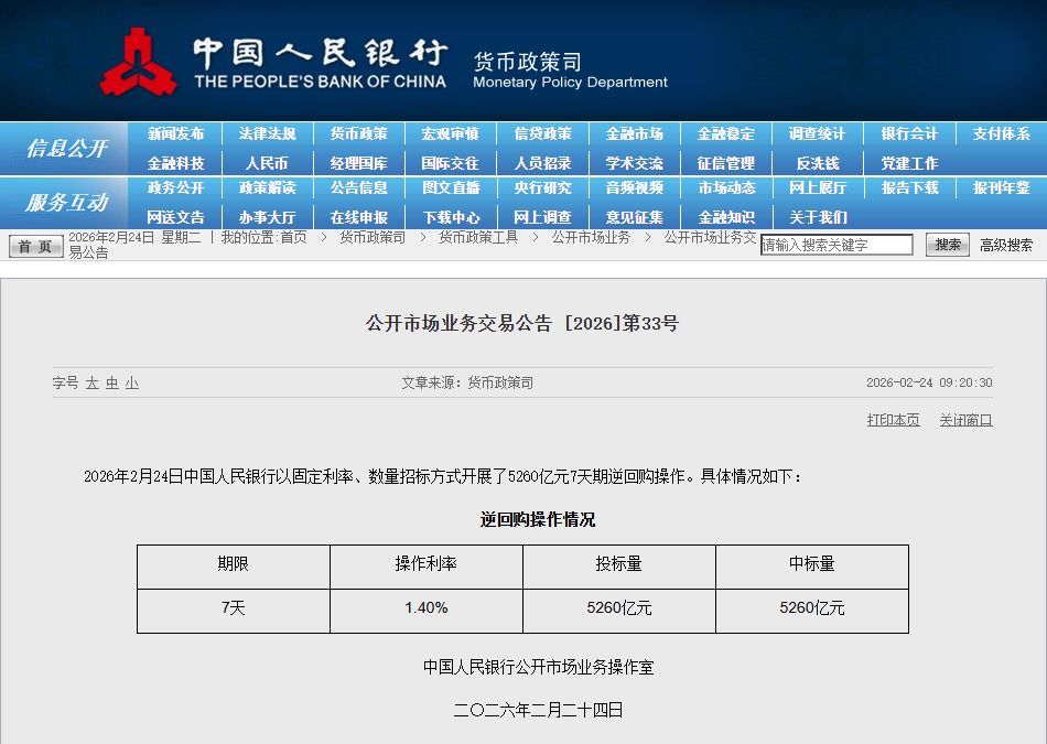据央行官网消息,2026年2月24日中国人民银行以固定利率、数量招标方式开展了5260亿元7天期逆回购操作。具体情况如下: