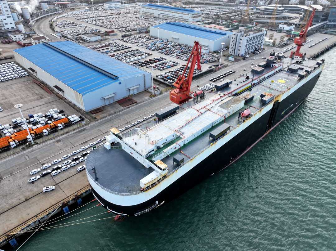 2月24日,江苏省连云港港东方港务分公司码头,滚装轮在装载出口轿车。