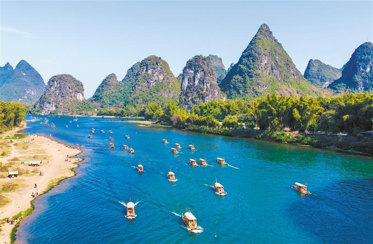 2月20日,广西桂林市阳朔县漓江,游客乘坐竹筏在绿水青山间穿行。夏立慧摄(中经视觉)