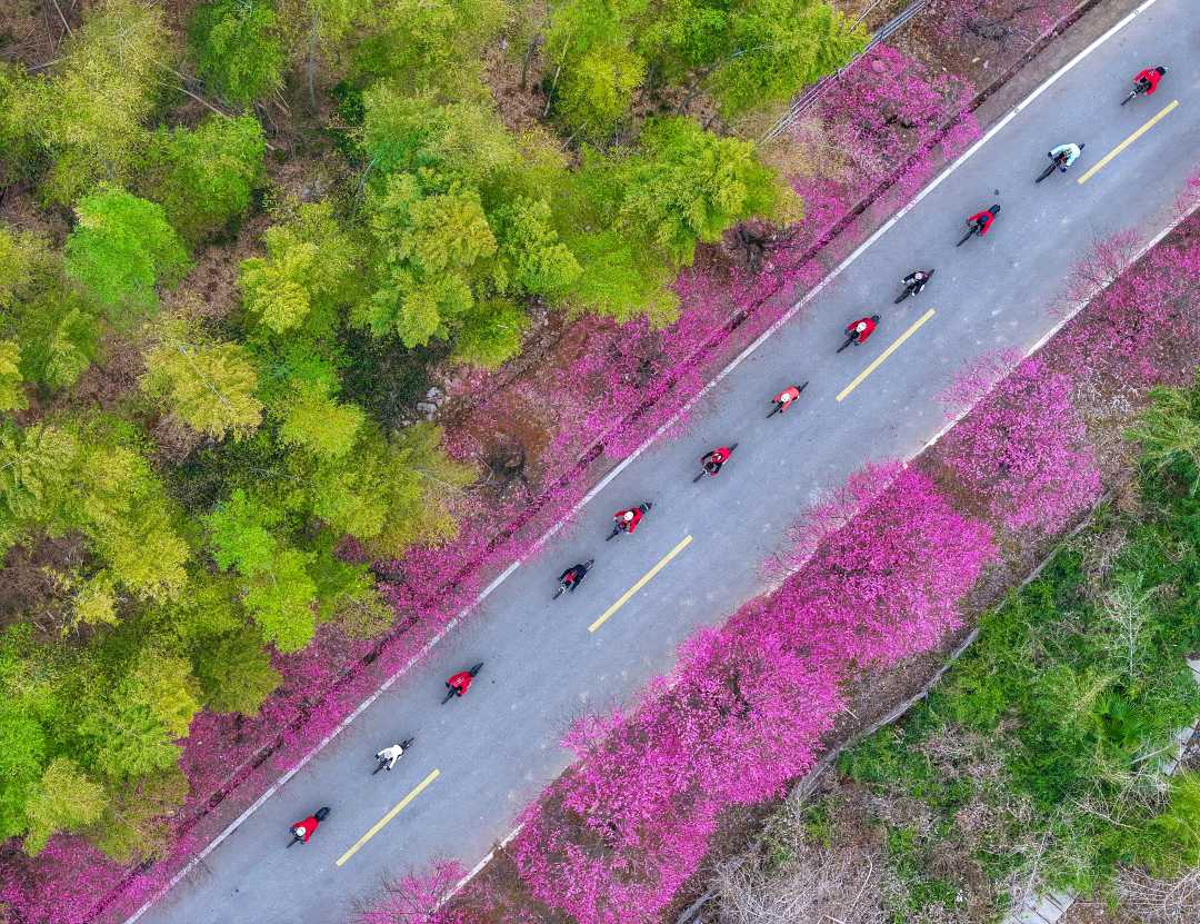 2月25日,骑行爱好者在浙江省湖州市长兴县龙山街道川步村骑车赏景。