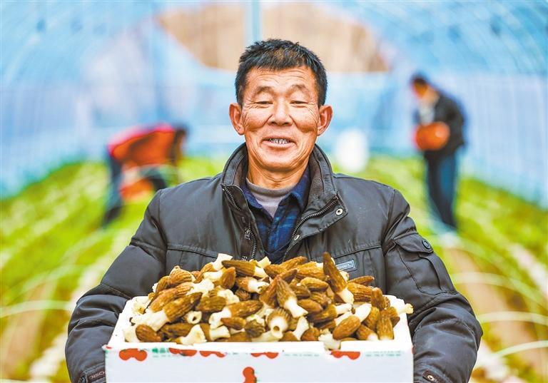 2月25日,安徽省马鞍山市刘山村羊肚菌种植基地,村民在采摘羊肚菌。王文生摄(中经视觉)
