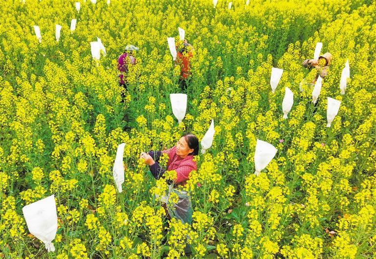 2月24日,重庆市垫江县沙坪镇毕桥村制种油菜基地,工人在给油菜授粉。龚长浩摄(中经视觉)
