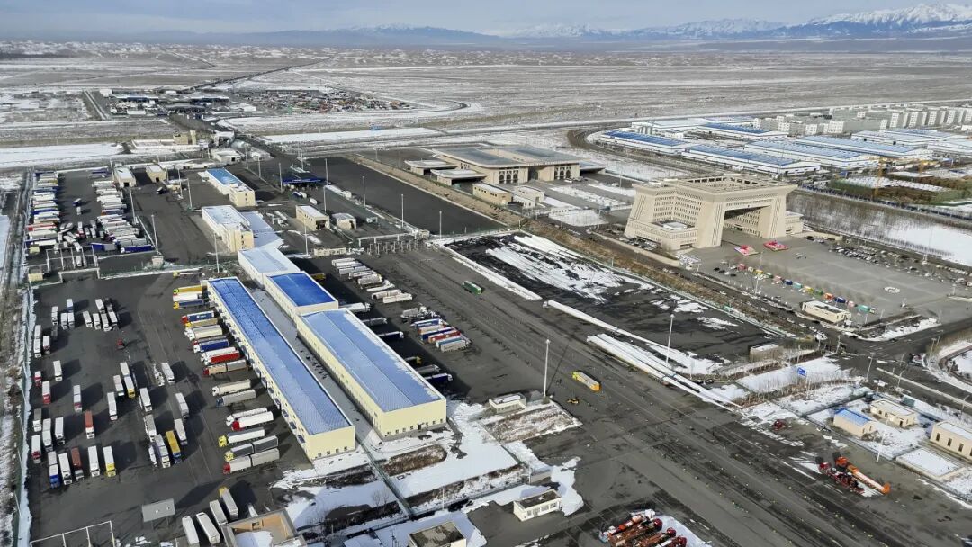 2月9日拍摄的中国新疆霍尔果斯口岸(右下)和哈萨克斯坦阿腾科里口岸(左上)。张啸诚摄(新华社)