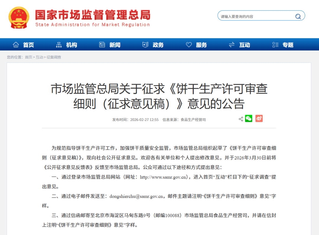 ■市场监管总局:为规范指导饼干生产许可工作,加强饼干质量安全监管,就《饼干生产许可审查细则(征求意见稿)》向社会公开征求意见。