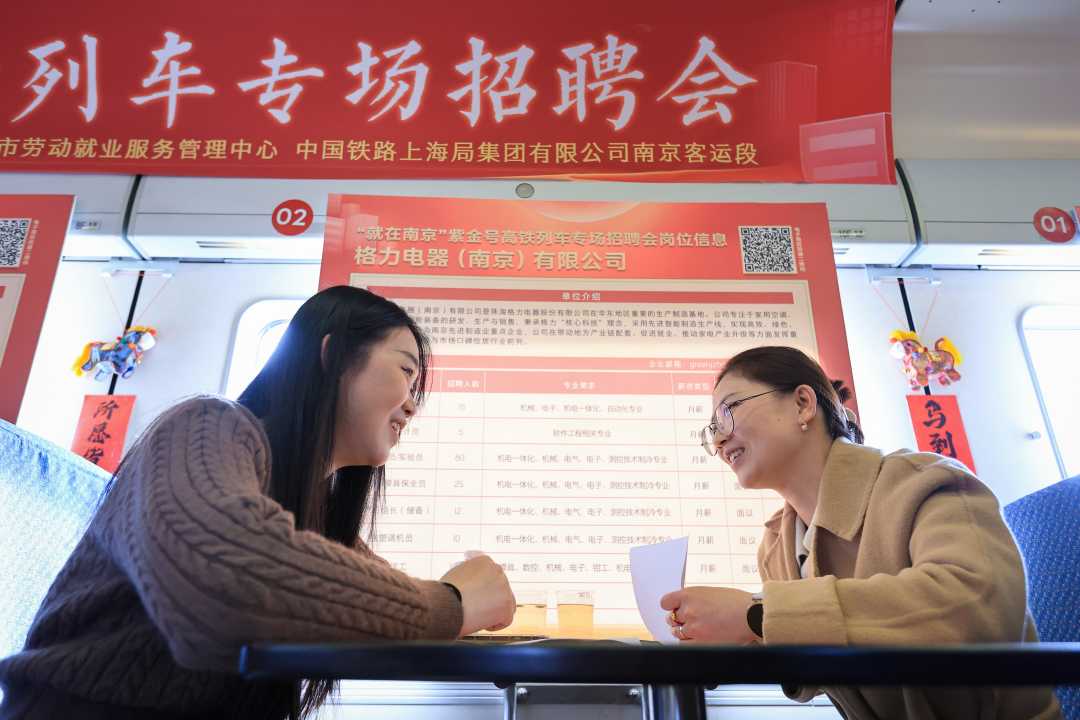 2月28日,一场高铁列车专场招聘会在南通开往南京的D9536次列车上举行,南京市人社部门工作人员和16家企业代表受邀来到列车上,为返校学生以及有就业需求的旅客提供就业政策解读、简历指导、岗位对接等服务。