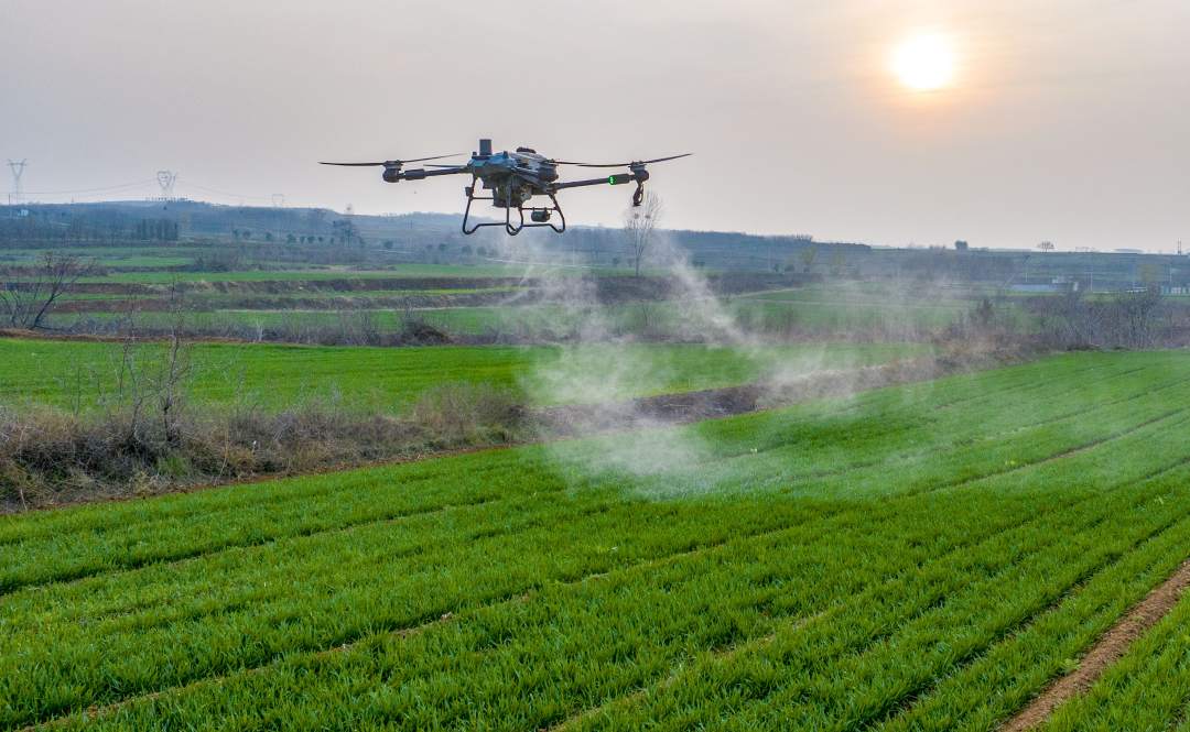 3月3日,河南省洛阳市诸葛镇陈沟社区高标准农田内,农户对小麦进行飞防作业。