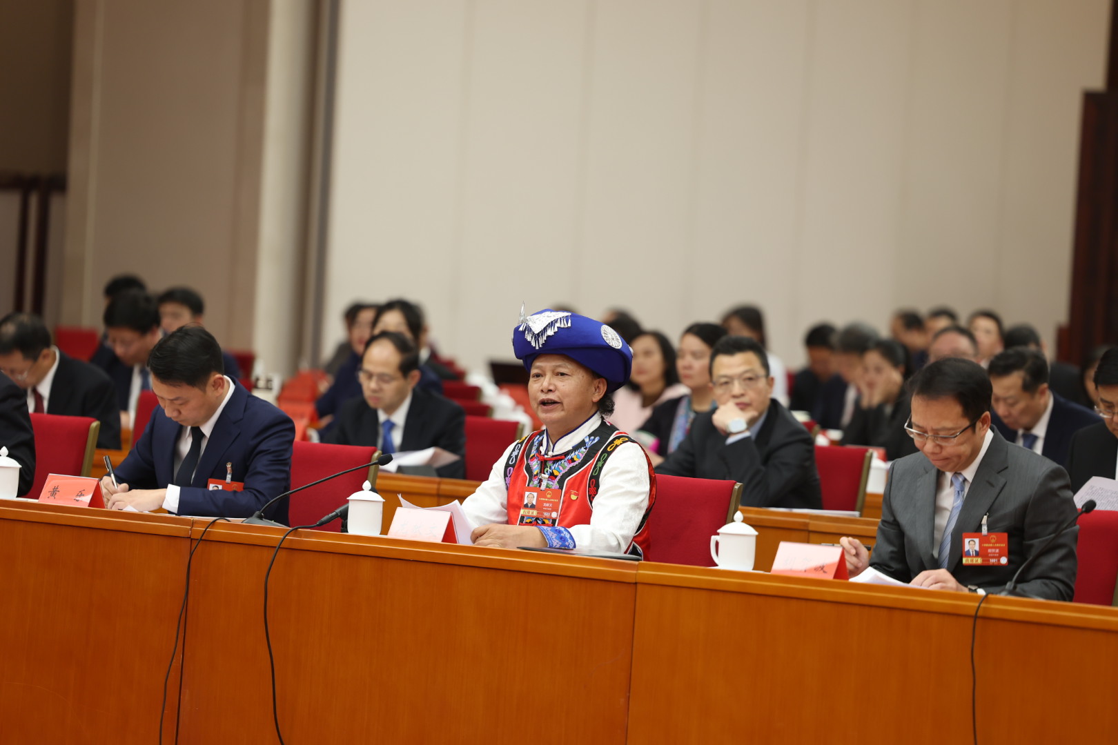 3月5日下午,人大湖南代表团在驻地举行全体会议,审议政府工作报告。全国人大代表、湖南省古丈县默戎镇牛角山村党总支书记龙献文(中)在发言。经济日报记者高兴贵摄