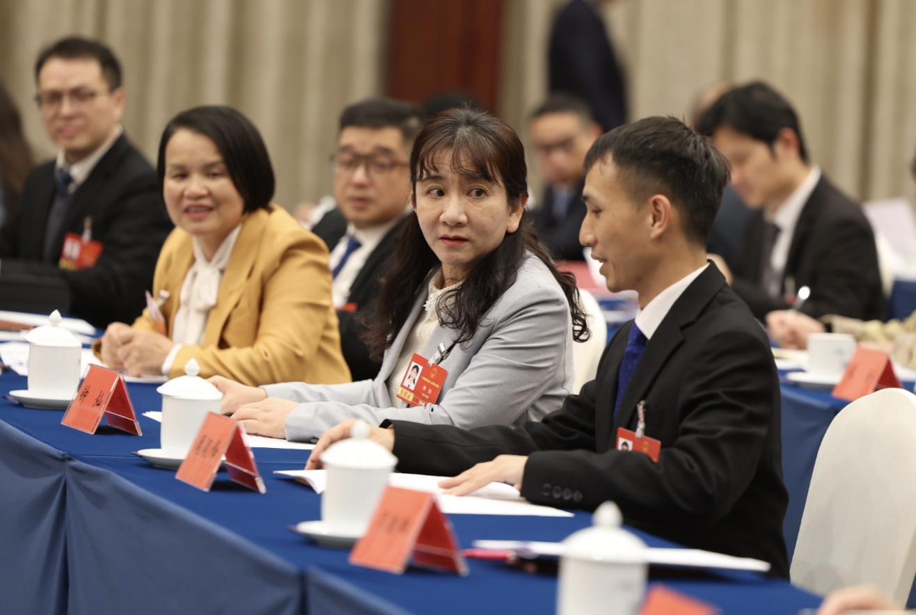 3月5日,人大广西代表团在驻地举行全体会议,审议政府工作报告。会前,全国人大代表钟灿(右二)、周颖峰(右一)就相关议题进行探讨。经济日报记者高兴贵摄