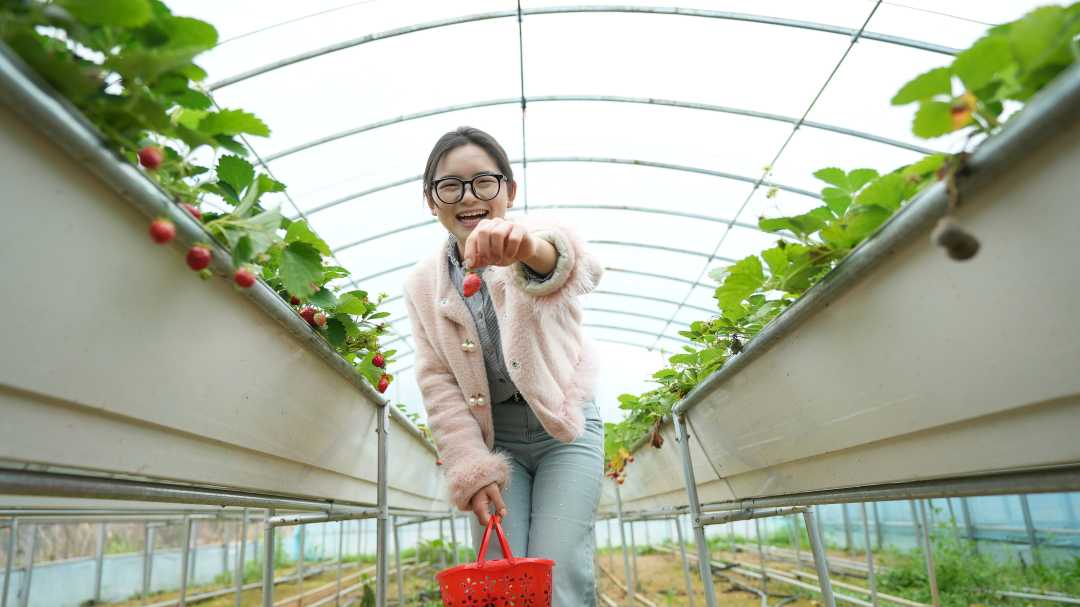 重庆市酉阳土家族苗族自治县龚滩镇红花村采摘草莓。