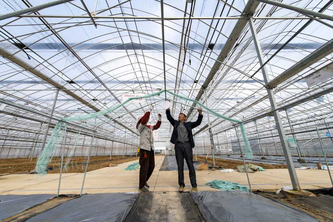 3月6日,浙江省金华市婺城区长山乡双龙实验室智慧农业示范园,工作人员在进行悬挂爬藤网作业。
