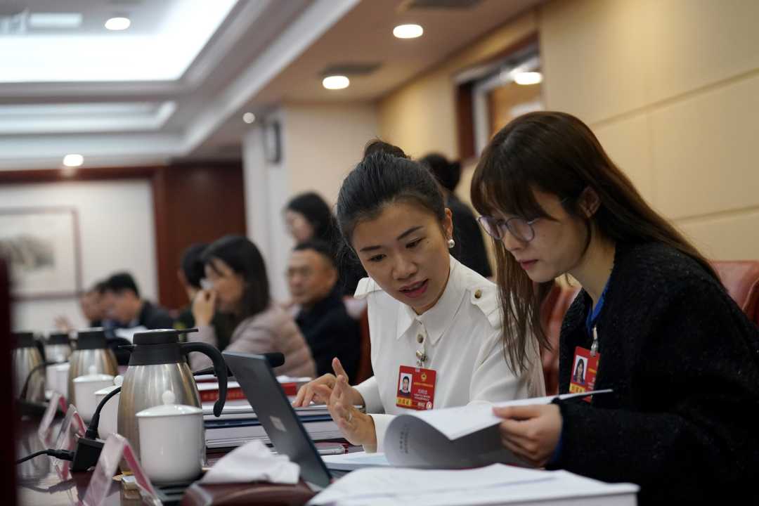 3月7日上午,全国政协十四届四次会议举行小组会议。图为共青团和青联界周荃委员(右一)在发言。经济日报记者赵晶摄