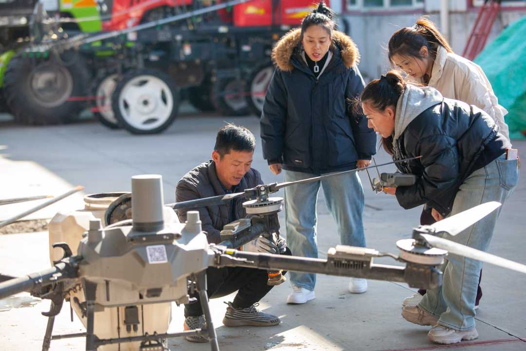 3月7日,山东省淄博市高青县,农民在参加无人机保养知识培训,为春季生产工作做准备