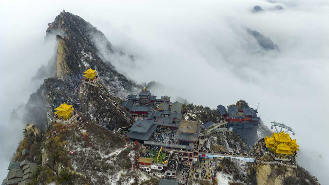 3月7日,河南省洛阳市栾川县老君山风景区群峰在云雾缭绕中若隐若现,风景秀美。