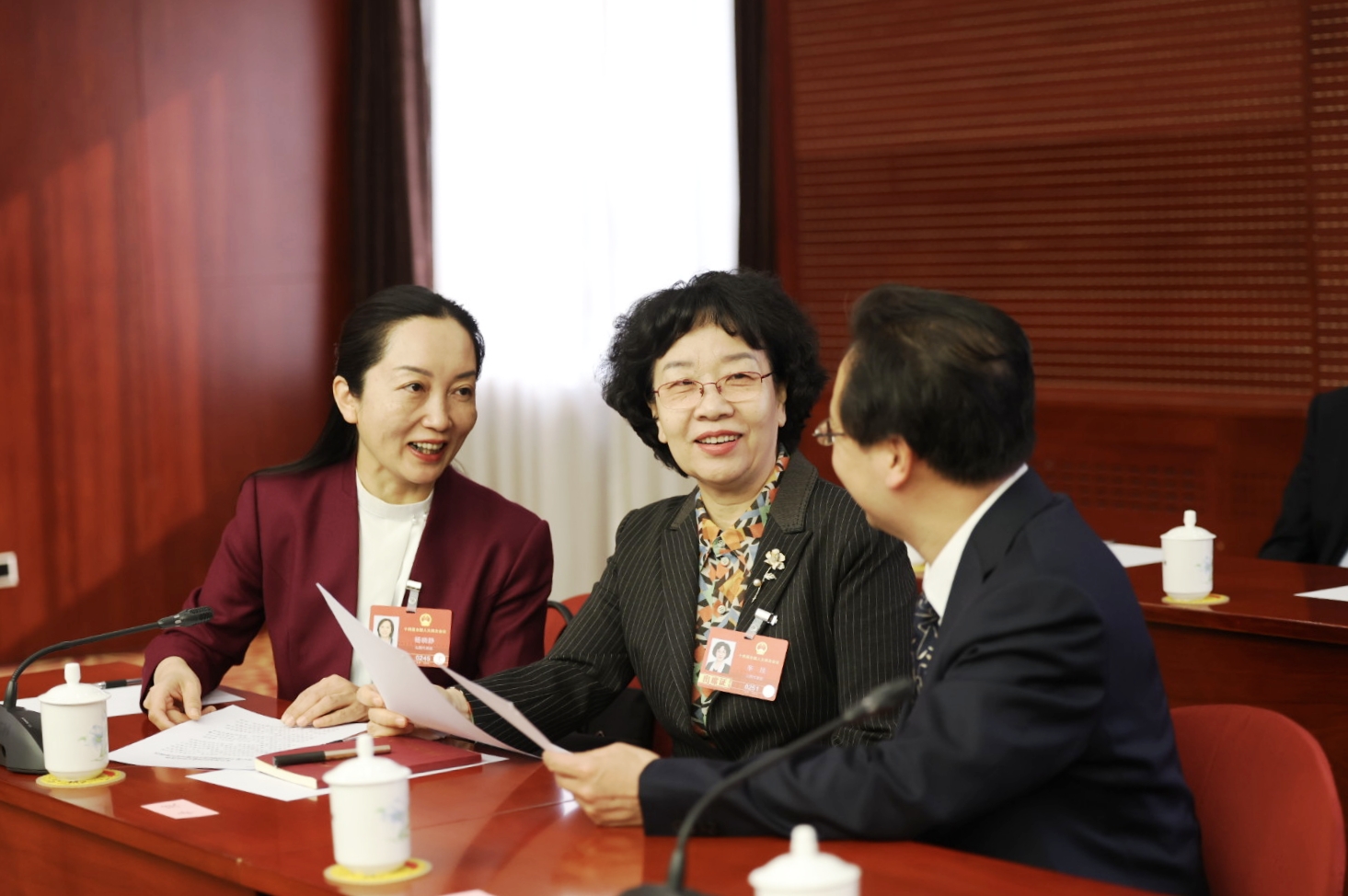 3月8日上午,人大山西代表团在驻地举行小组会议审议生态环境法典草案。会前,代表们交流看法。经济日报记者高兴贵摄