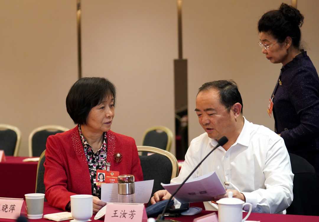 3月9日,全国政协十四届四次会议在委员驻地举行小组会议。图为九三学社界两位委员在讨论交流。经济日报记者赵晶摄