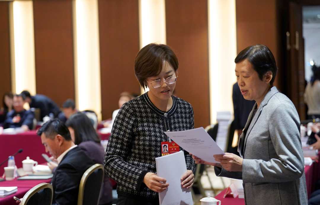 3月9日下午,全国政协十四届四次会议举行小组会议,讨论“两高”工作报告,审议各项决议和报告草案。图为社会福利和社会保障界诺敏委员(左)和龙墨委员(右)交流讨论。经济日报记者赵晶摄