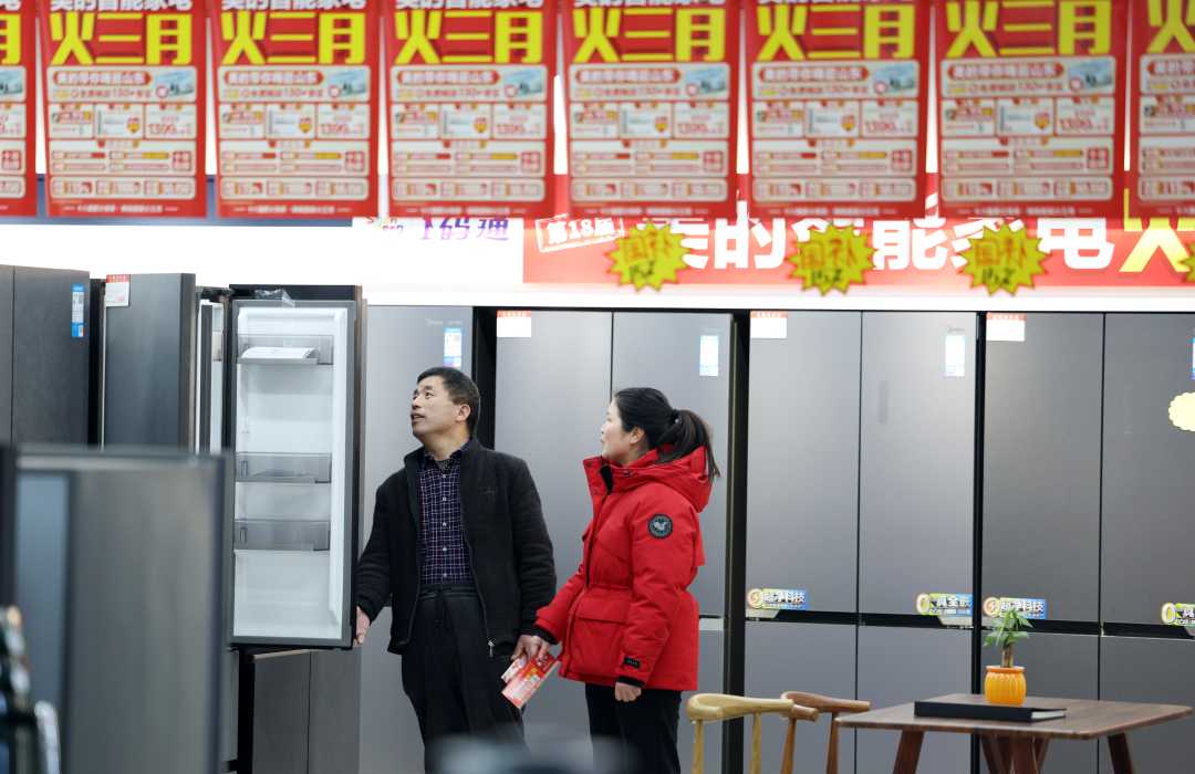 3月9日,山东省临沂市郯城县一家电商场,顾客在了解“国补”政策并选购冰箱。