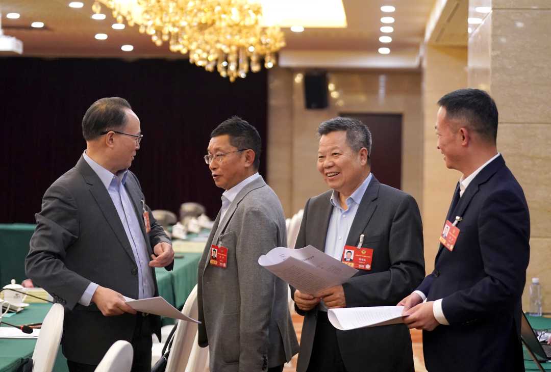 3月10日下午,全国政协十四届四次会议在委员驻地举行小组会议。图为几位无党派人士界委员在会前交流讨论。经济日报记者赵晶摄