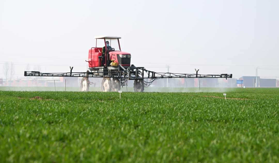 3月10日,河北省邢台市金沙河农作物种植专业合作社万亩基地,农民驾驶自走式喷雾机为小麦喷洒除草剂和营养液。