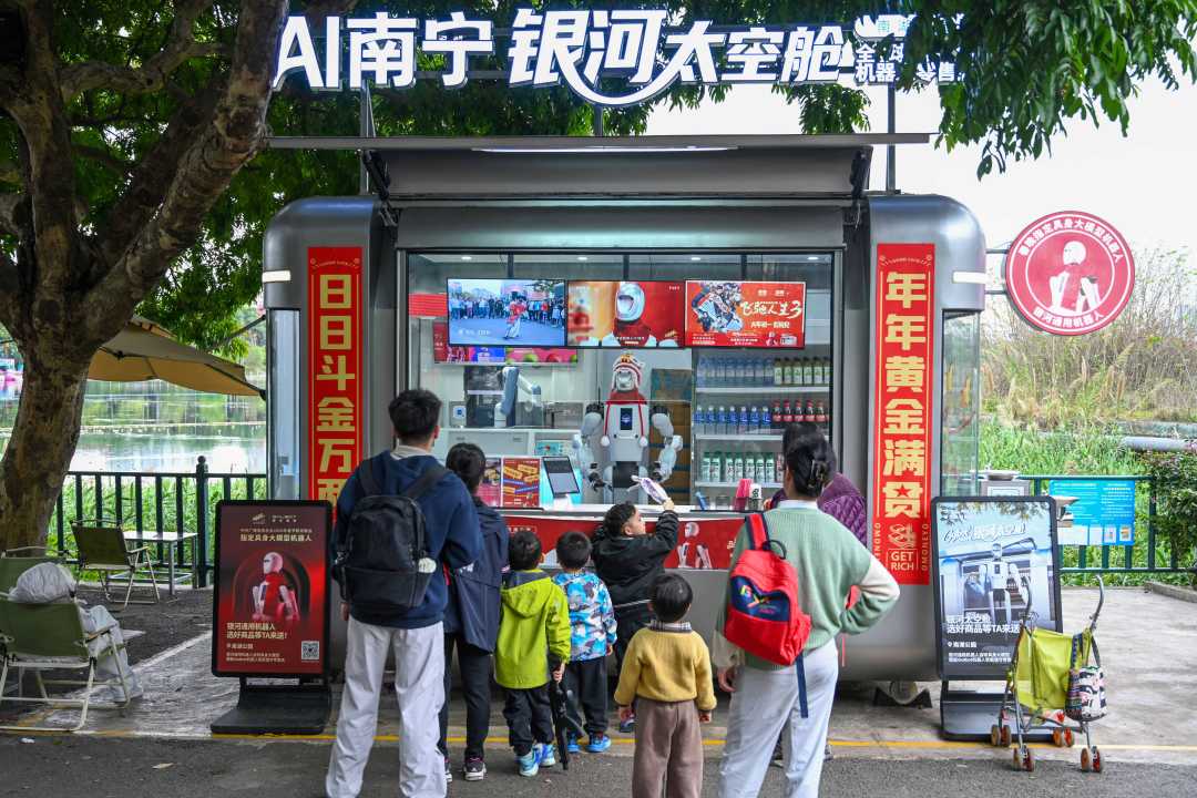 3月10日,广西壮族自治区南宁市南湖公园一自助咖啡店,“AI咖啡师”受到市民欢迎。