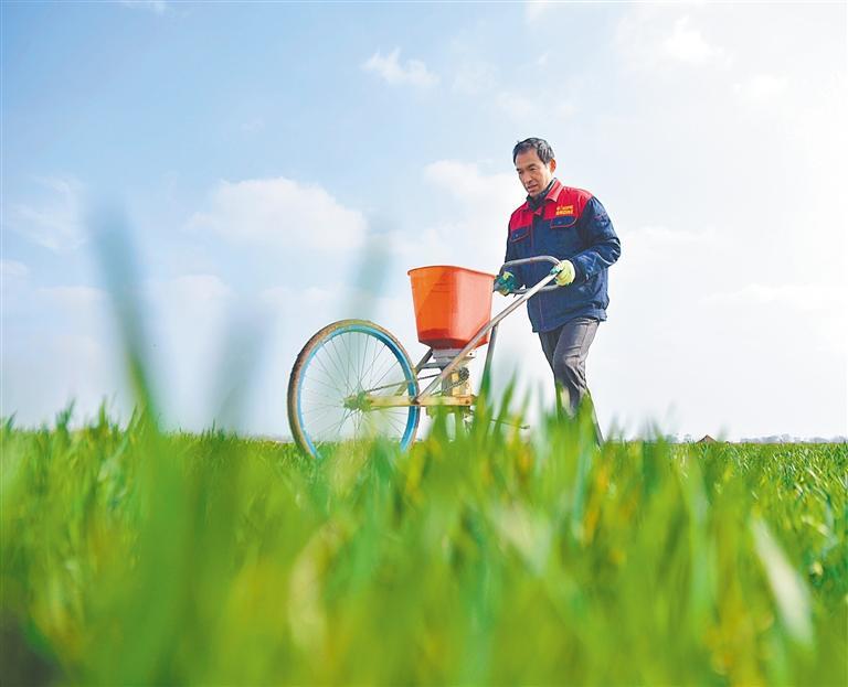3月6日,山东省聊城市茌平区贾寨镇堤头袁村,农民进行小麦施肥作业。赵玉国摄(中经视觉)