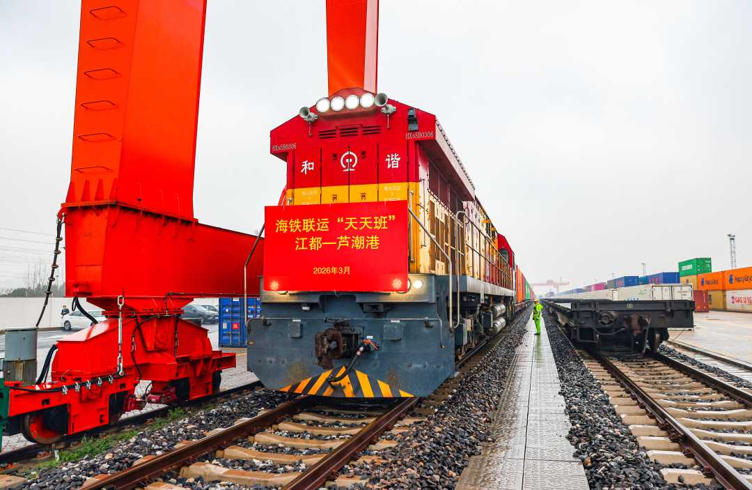 3月16日,南京铁路物流中心江都物流基地,装载货物的江都—芦潮港海铁联运“天天班”首班专列准备驶往上海芦潮港,抵达后转航运发往欧洲。该线路2024年10月开通,初期每周开行3—4列,此次升级为每日一班,预计年发送货物35万吨。