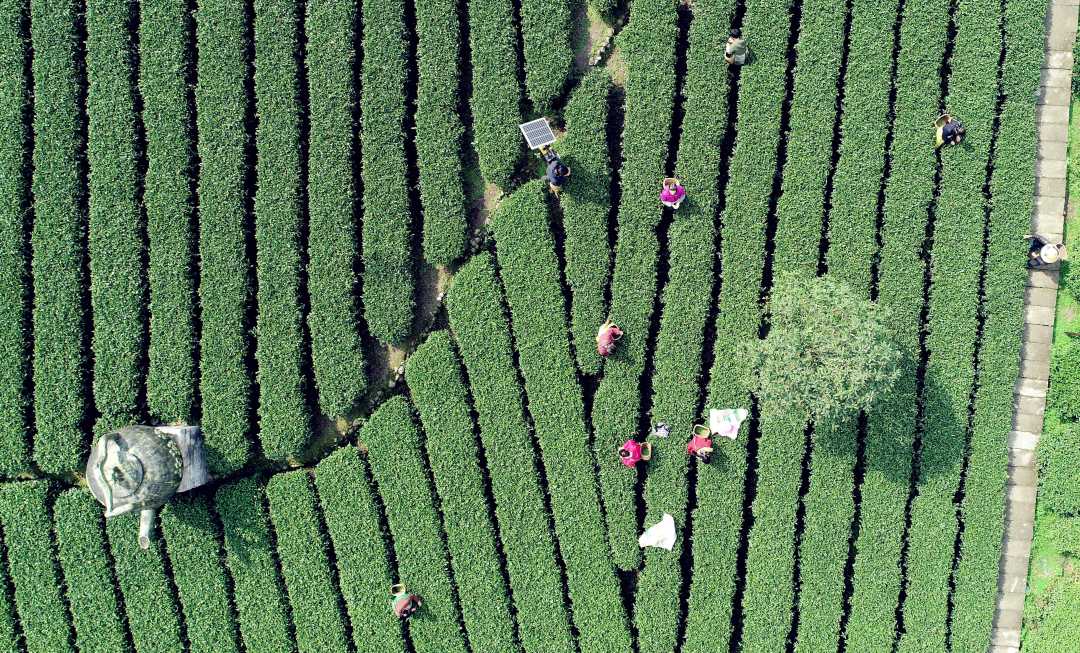3月17日,茶农在江西省吉安市遂川县万亩茶园采摘春茶。正值春茶采摘黄金期,茶农穿梭于翠绿茶园间,采摘“狗牯脑茶”这一历史悠久的名优茶种。