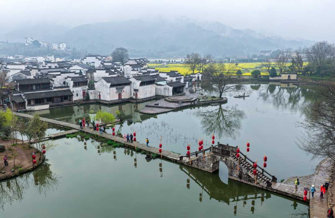 3月17日,安徽省黄山市徽州区呈坎古村,新绿的柳枝、盛开的油菜花与古桥民居构成一幅色彩斑斓的江南春景图。