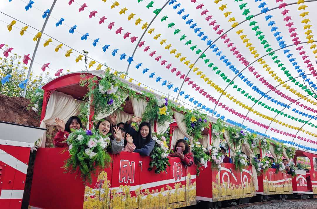 3月17日,四川省广安市前锋区观塘镇仁和村,游客乘坐观光小火车驶过风车隧道。