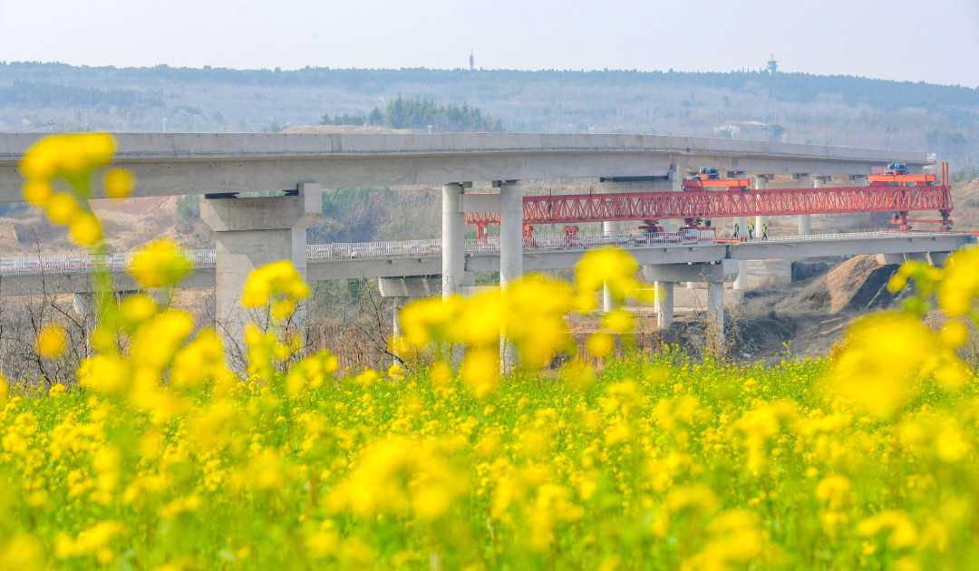 3月21日,在河南省洛阳市伊滨区诸葛镇的郑州至洛阳高速公路项目建设现场,工人正在龙门枢纽进行箱梁架设施工。