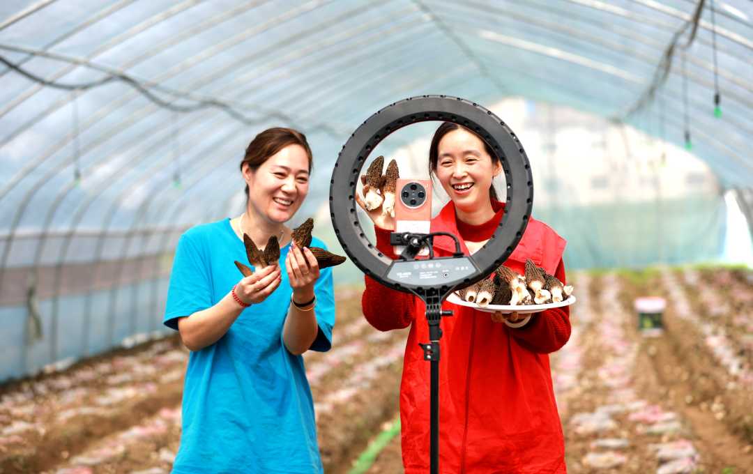 3月21日,安徽省阜阳市颍东区正午镇海明食用菌产业园,青年党员干部通过网络直播,帮助园区推销新鲜羊肚菌。