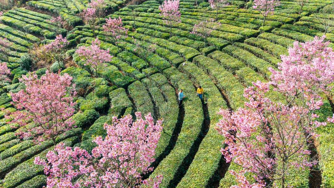 3月21日,湖北省黄冈市英山县河东樱花园内,层层叠叠的茶园与盛放的早樱相映成趣,游客穿行其间体验采茶,感受春日里茶乡的独特韵味。