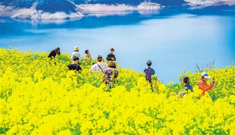 3月7日,浙江省绍兴市新昌县沃洲湖,油菜花竞相绽放,吸引游客赏花拍照。