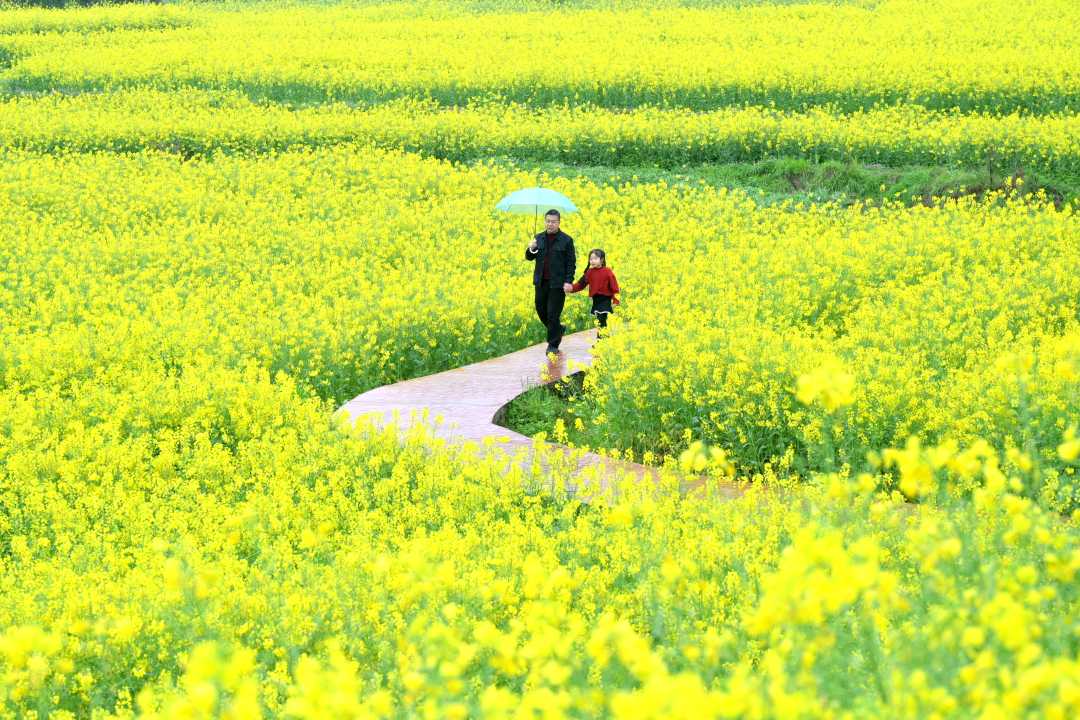 3月22日,湖南省双峰县梓门桥镇街埠头村,游客在油菜花田中游玩。