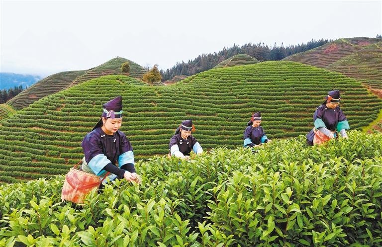 3月11日,湖南省怀化市通道侗族自治县菁芜洲镇地连村九层岭茶场,茶农在采摘春茶。李尚引摄(中经视觉)