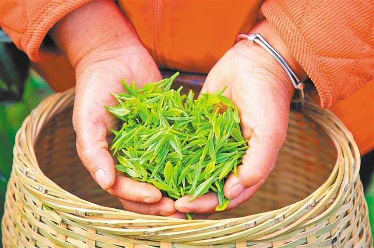 3月22日,浙江省玉环市大麦屿街道石峰山火山茶基地,茶农展示新采的茶。段俊利摄(中经视觉)