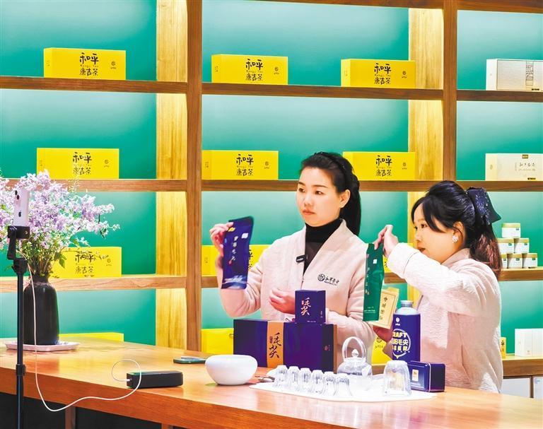 3月20日,陕西省安康市紫阳县一茶叶公司,员工在展厅直播销售茶叶。储茂银摄(中经视觉)